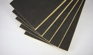 Feltro ou placa de lã de vidro aglomerada por resinas sintéticas, revestida em uma das faces por véu preto, com características termo-acústicas.